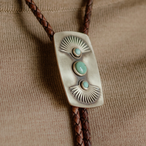 These handmade pieces are our modern interpretation of a classic style and were created with versatility, quality, functionality, and personal expression in mind. Each bolo is crafted from brushed, hand-patinaed, layered solid brass and a natural braided leather cord with solid brass tips, and a hinged tension clasp for easy adjusting.