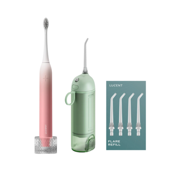 Upgrade your daily dental routine with this complete oral care bundle, featuring the Prism Sonic Toothbrush, Flare Water Flosser, and a 4-pack of Flare Refill Nozzles. The Prism Toothbrush offers a powerful yet gentle clean with three smart brushing modes, a flexible silicone head, and wireless charging that lasts up to 90 days. Pair it with the Flare Water Flosser, which uses high-frequency water streams to reach deep between teeth and along the gumline for a fresh, floss-free clean. Designed with travel in mind, the flosser’s collapsible form makes it easy to take anywhere. With four extra nozzles included, this set ensures lasting oral health wherever you go.