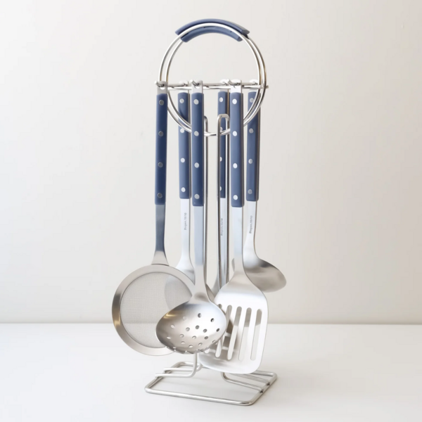 Includes: a serving spoon, strainer, spatula, skimmer, large ladle, small ladle, and a stand.