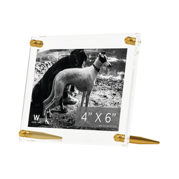 Each frame includes two acrylic panels—measuring 3/16" and 1/8" thick—with polished edges, along with two 0.5" diameter metal fasteners and two 2.5" long metal stands, available in Silver, Gold, or Graphite. The stands can be easily swapped to allow interchangeable portrait or landscape framing.