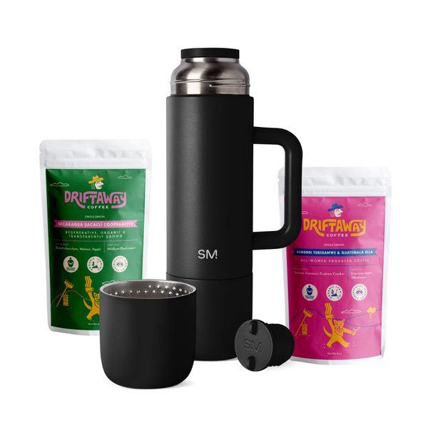 With the Roam Bottle’s durable stainless-steel build, leakproof pour-anywhere lid, and two threaded 12oz mugs, plus two responsibly sourced, small-batch coffees, this bundle makes it effortless to brew, share, and enjoy great coffee wherever you roam.