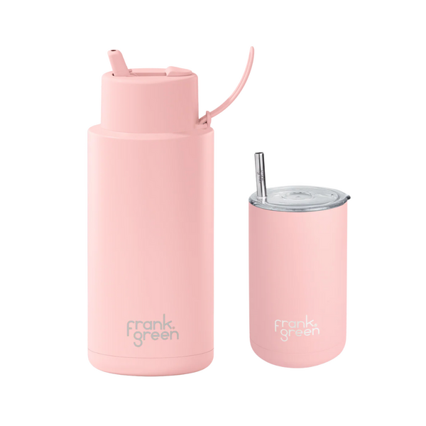 Upgrade your daily drink routine with this premium Frank Green bundle featuring the 34oz Ceramic Reusable Bottle and the 15oz Iced Coffee Cup with Straw. Designed for all day hydration, chilled coffees, and even cocktails, this set pairs clean taste technology with durable, travel friendly design. The ceramic lined bottle keeps drinks tasting pure with long lasting insulation, while the iced cup keeps ice solid for up to 12 hours. Whether you're heading to work, the gym, or weekend plans, this duo keeps every sip elevated and effortless.