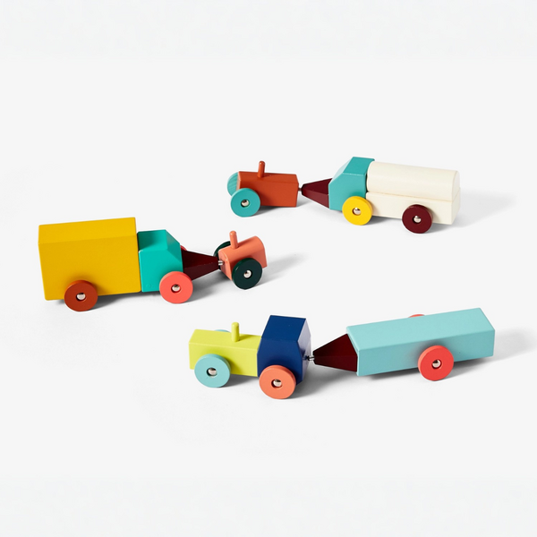 Hovers Toys are crafted from contemporary shapes and painted in bright colors—a simple design that celebrates locomotives and tractors, and the innovation, perseverance, and creativity they brought to the world. Join the engines and cars by their embedded magnetic connectors to create your own playful arrangements.