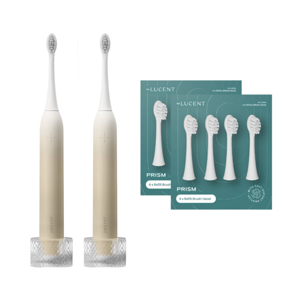 Set Includes: 2x Prism Sonic Electronic Toothbrush, 2x Toothbrush Heads 4-pack