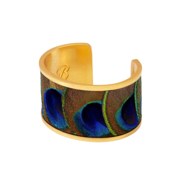 Our Mary Ann Peacock Feather Cuff is crafted with real eye feathers featuring stunning hues of teal, turquoise, and gold. Each feather is hand-selected, ensuring a one-of-a-kind finish, while all materials are all-natural and sustainably sourced.