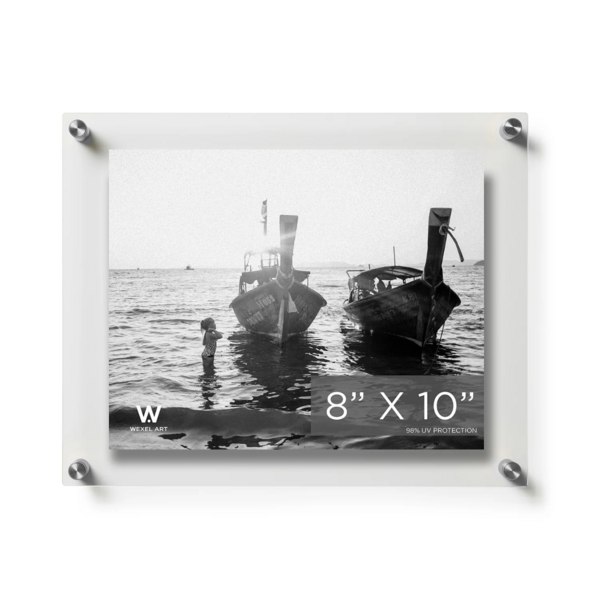Bring your framing game to the next level with these stunning acrylic floating frames with gorgeous metal hardware. Two floating acrylic panels "sandwich" your artwork for a sleek, borderless display. Wexel Art’s frameless design puts the focus on your art or photos, while the 98% UV-protected, mar-resistant, diamond-polished acrylic ensures clarity and durability. Hang vertically or horizontally to suit your space.