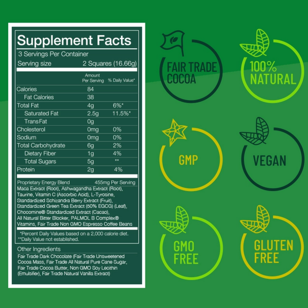 Functional Dark Chocolate formulated to address the issues associated with low energy. Clinically researched ingredients supported with vitamins, herbs & minerals, delivered in delicious dark chocolate.